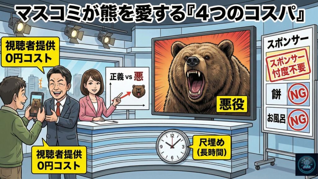 対して、野生動物である「熊」にはスポンサーがいません。いくら悪者にしても営業的な配慮をする必要がないため、マスコミにとって非常に「叩きやすい(扱いやすい)」存在なのです。