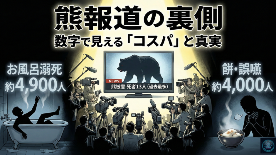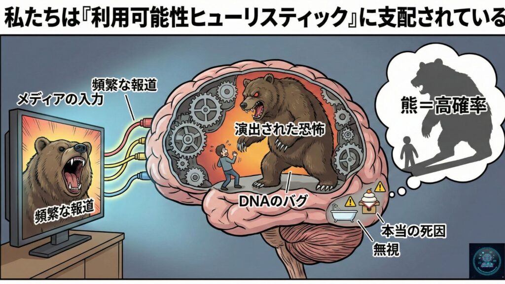お風呂よりも熊を怖がるのでしょうか? それは、人間が「頻繁に見るもの」=「発生確率が高い」と錯覚する脳のバグ(利用可能性ヒューリスティック)を持っているからです。 飛行機事故と同じで、派手な事故ほど「怖い」と感じますが、実は地味な事故(転倒や餅)の方が圧倒的に多くの命を奪っています。