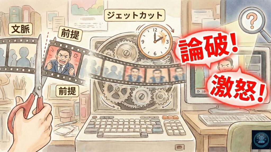 前後の文脈や「前提条件」をカットし、過激な発言だけを繋ぎ合わせる。 | 本来の意図とは逆の印象を持たせ、「敵」か「味方」かの二元論に落とし込む。 |
