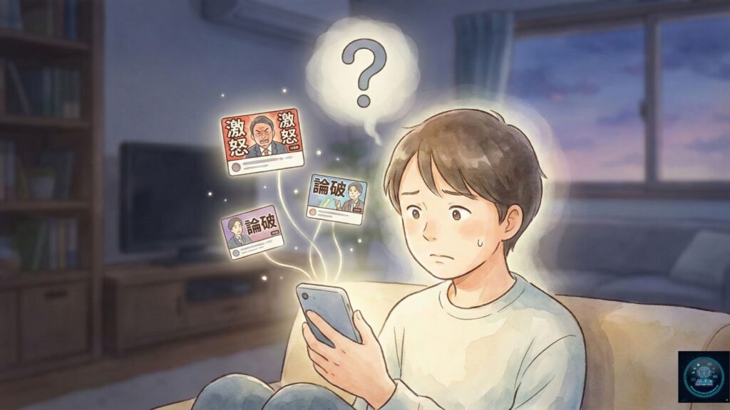 動画の内容を見る前に、サムネイルや冒頭の巨大なテロップで「論破」「激怒」「放送事故」「完全勝利」といった強い言葉を見たことはありませんか?