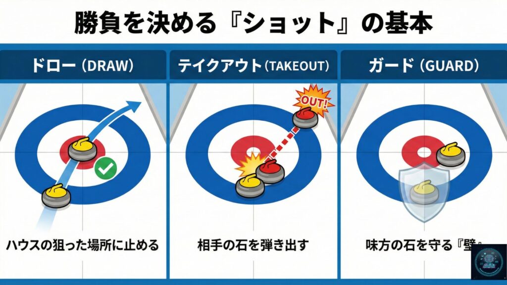 ハウス(円)の中に石を置くだけでなく、その手前のガード石とハウス内の石を絶妙な距離感で連動させます。