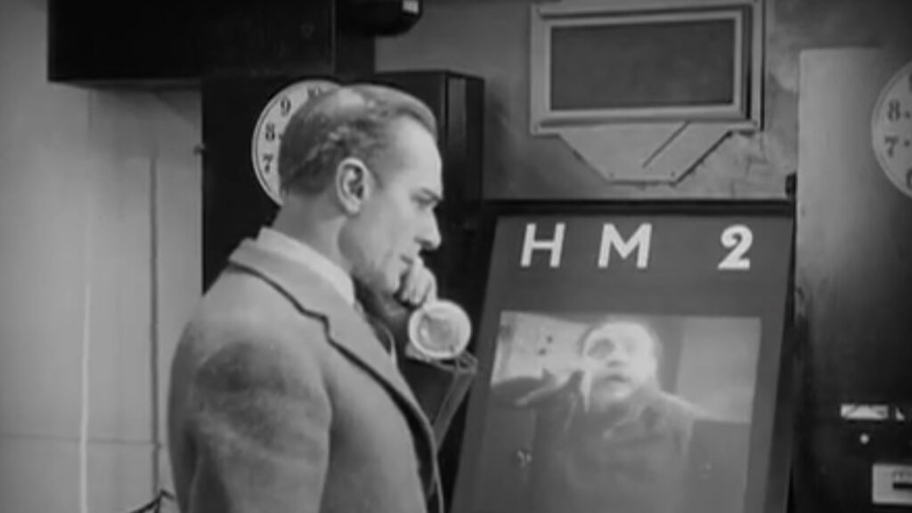 劇中、都市の支配者であるフレーダーが、壁に埋め込まれたスクリーンと受話器を使い、工場の責任者と通話をするシーンが登場します。