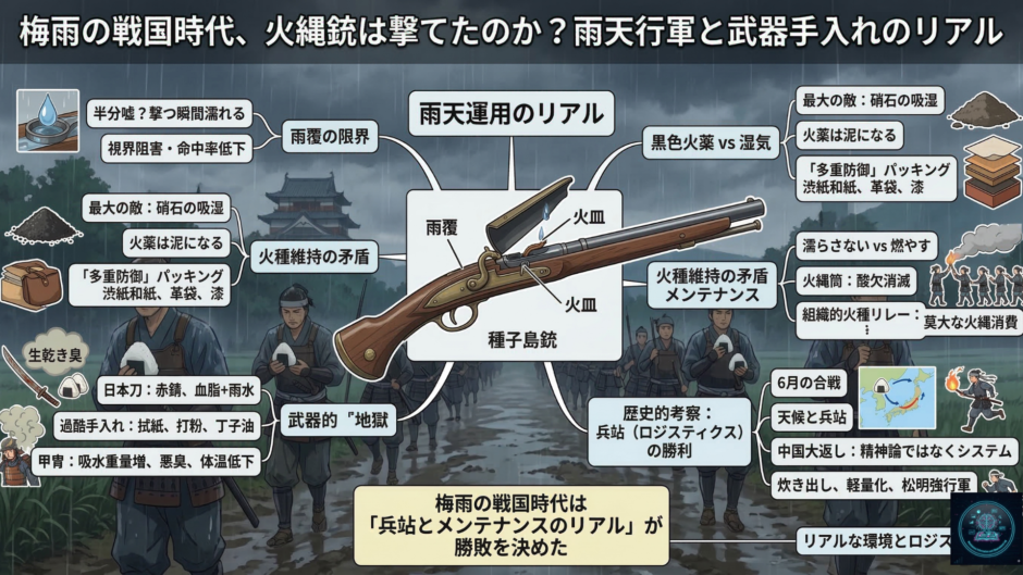 梅雨の戦国時代、それは名将の采配以上に、「いかにして乾いた火薬を運び、いかにして兵士の装備を軽くするか」という、ロジスティクスを制した者が天下を制する季節だったと言えるのではないでしょうか。