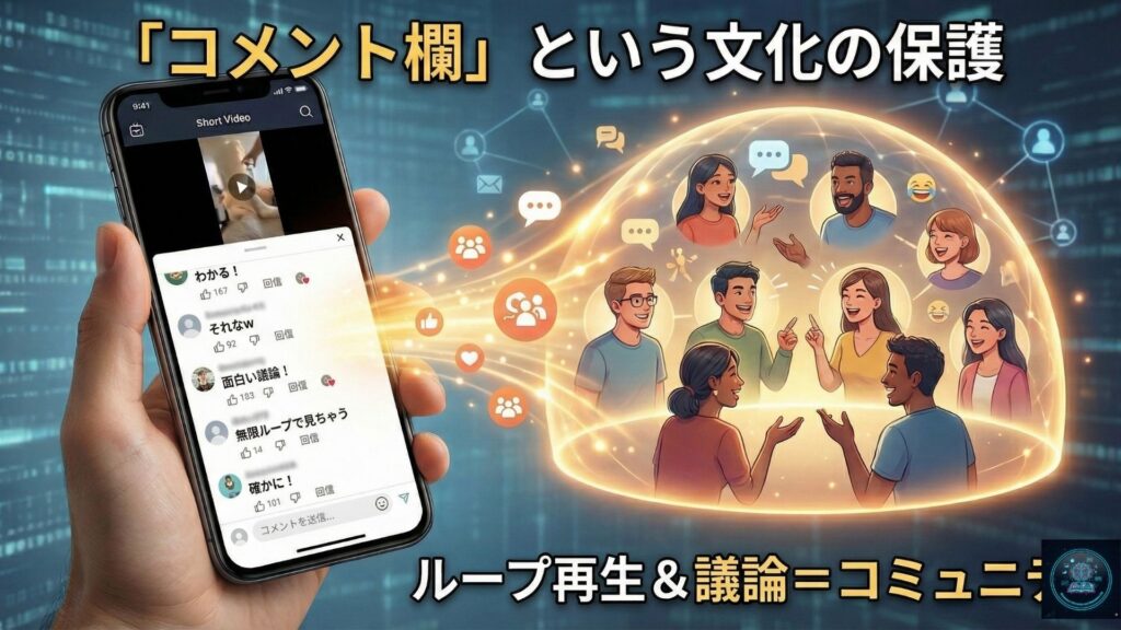 映像そのものは15秒で終わっても、コメント欄で面白い大喜利や議論が起きていれば、ユーザーは動画を何周もループ再生させながらコメントを読み続けます。