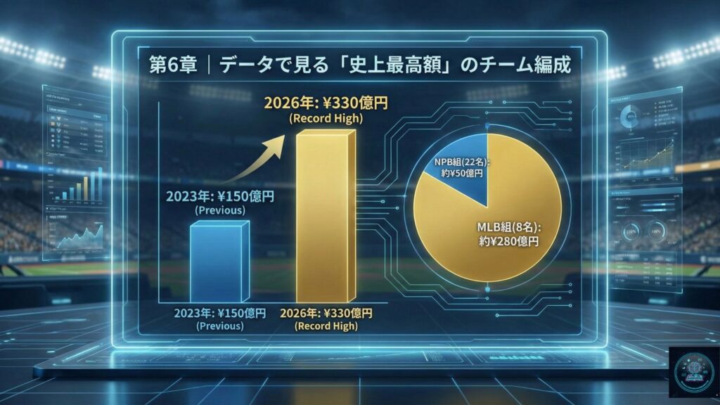 2026年 侍ジャパン推定総年俸(単年) 約 330億円 ※MLB組8名+NPB組22名の合計試算