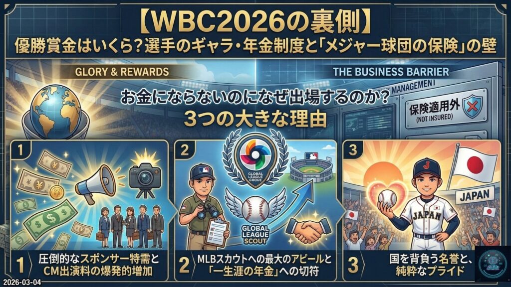 本記事では、2026年最新のWBCにおける優勝賞金や選手のリアルな報酬額を解き明かし、さらに「お金にならないのになぜ彼らは出場するのか?」という謎、そして今大会を大混乱に陥れている「保険の壁」について、徹底的に考察していきます。